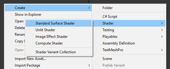 - 右键单击项目视图 -> 创建 -> 着色器 -> 标准表面着色器