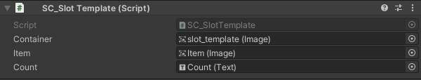 - 将 SC_SlotTemplate 脚本附加到"slot_template" 对象,并分配其变量(同一对象上的图像组件转到"Container" 变量,子"Item" 图像转到"Item" 变量,子 "Count" 文本转到 "Count" 变量)