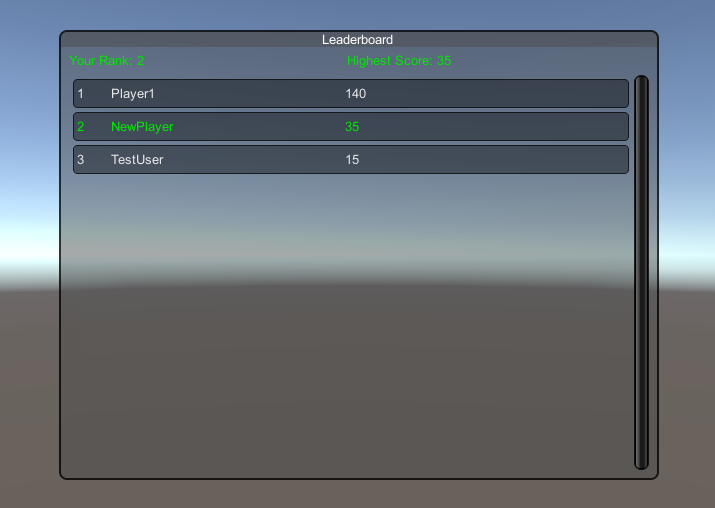 一切设置完毕后,当您单击排行榜时,它应该加载您的分数/排名以及根据分数排名前 100 名的玩家: