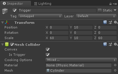 - 将 MeshCollider 组件添加到 "Trigger" GameObject,选中 Convex 和 IsTrigger 复选框,并将其 Mesh 更改为默认 Cylinder